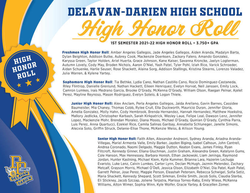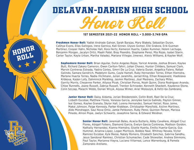 DDHS is thrilled to announce the students who have made the high honor (3.750+ GPA) and honor roll (3.000-3.749 GPA) for the 1st semester of 2021-22. Congrats to all of you for making the honor roll.